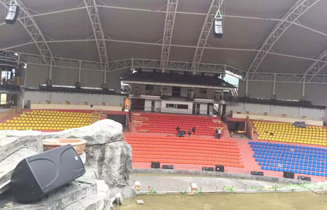 对于部分露天场景,我们优先考虑到设备的经久耐用,露天场所对于设备的防水,尘,腐蚀要求较高,多方面研究,决定用对当前项目性价比更高的S系列高声压塑胶音响,S1200N 22只,这款音响不仅保证了景区环境音乐的声压标准,还有极好的音质。解决了游客游览景区由于设备不好造成的背景音乐的噪声,功放方面我们选择了市场上先进的数字功放,Q3i 19台、Q5i 2台,其内置强大的DSP功能,能很好的处理现场传输的声音,让系统稳定,强大,声音还原度高,这套系统能极好的满足半露天剧场和部分露天景区的扩声效果。