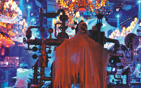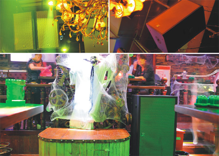 漫步入场,吧台顶壁上依旧挑着两颗骷髅假面,摇头灯射出的一束束幽冷的紫蓝光不时的扫向正中的僵尸残骸,黏在吊灯上的破纱布、杂乱无章的巨型蜘蛛网、阴森在角落里的巫婆鬼脸,仿佛依旧沉浸在24小时前的狂欢和劲舞的氤氲里。