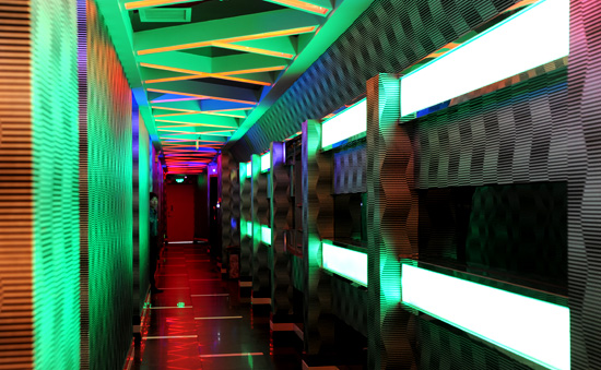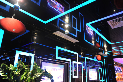 七彩的梯形中厅拱门、方胜元素链接的长廊、流线裱饰的金属墙身、大红大紫的传统吊饰、可口的酒水小吃、自动选物售卖机、街头篮球机,亮点无穷,乐趣多多。百变K王,量贩市场中的变色龙。
