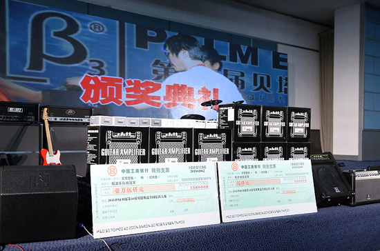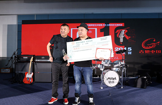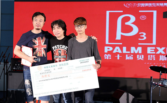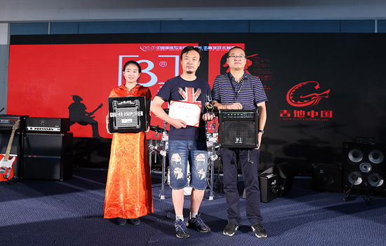 三基音响总裁刘恩海颁发Palm展第10届贝塔斯瑞乐队大赛电吉他组季军奖:李宁