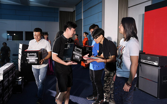 刘麟颁发Palm展第10届贝塔斯瑞乐队大赛电吉他组冠军的获奖选手:刘天宇